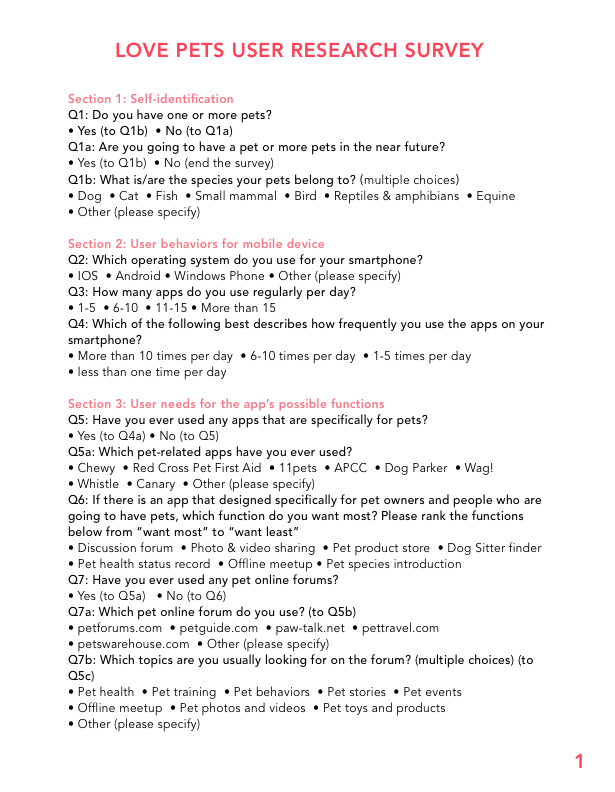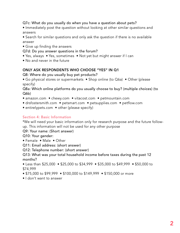 I conducted 10 user interviews for this research. My target users for the app would be people who have pets and people who are going to have pets. In order to reach my target population, I used an email list to find people who own pets or plan to have pets.